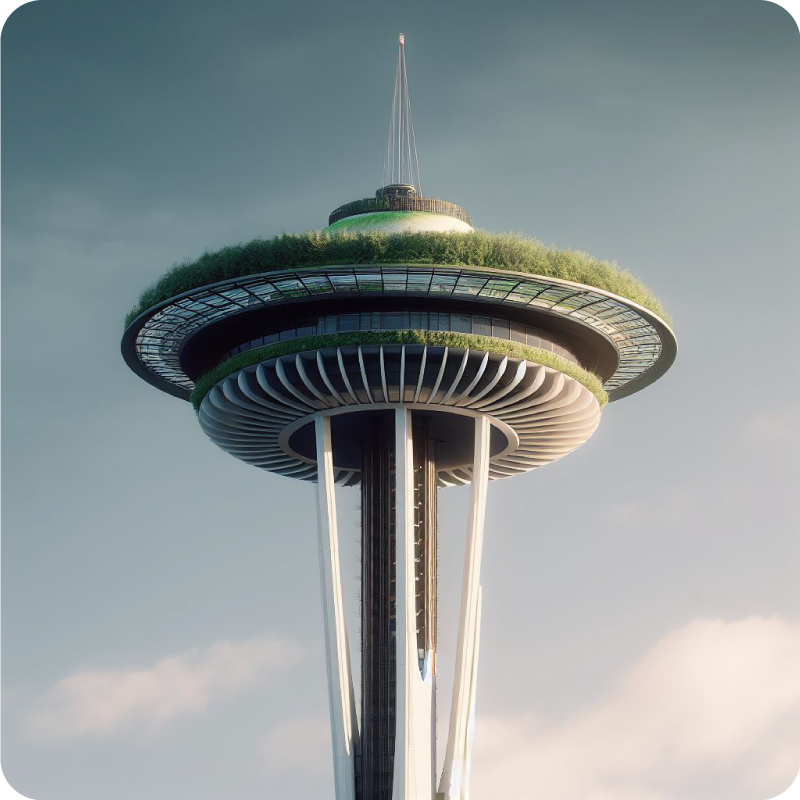 Here's a unique take on Seattle's Space Needle, a landmark of Futurist architecture with its sleek, modern lines and soaring height. In this imaginative depiction, parts of its 13,273 square-foot rooftop are transformed with patches of green, living spaces. It's an intriguing idea, showing how even such a futuristic structure can incorporate elements of nature, subtly integrating green spaces into its iconic design. Living roof maintenance at that height could prove tricky, however.
