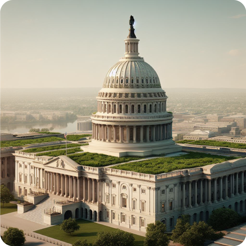 Take a look at the United States Capitol in Washington, DC, the iconic symbol of American democracy and the meeting place of the U.S. Congress, with a green twist. With around 167,932 square feet of flat roof area, it is the perfect candidate for a green roof makeover. AI offers a fascinating blend of tradition and modernity in the image, showing how even government buildings can embrace sustainability while maintaining their historic significance.