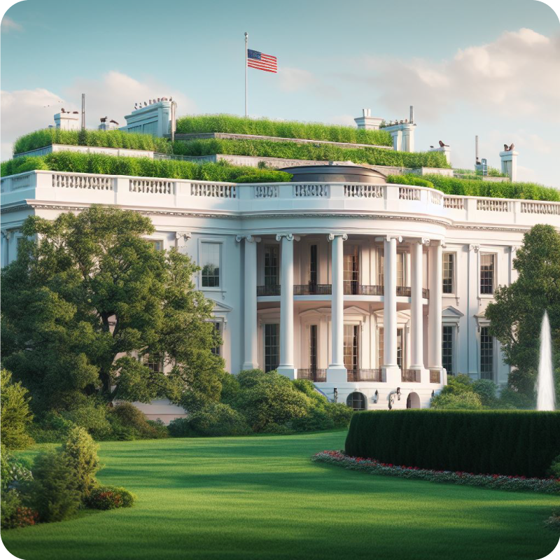 This image gives us a new take on the White House in Washington, D.C., the residence and office of the President and First Family. It reimagines the building's Neoclassical style, complete with its familiar columns and symmetry, but with a twist: a green, living roof.