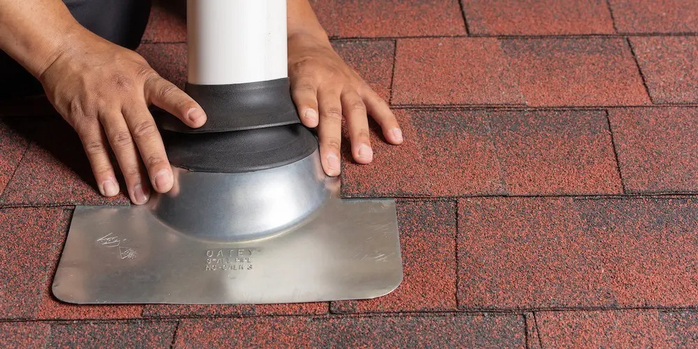 In addition to skylights and dormers, vent pipes are one of the most susceptible areas of the roof to leakage. Though most of these pipes feature flashing boots sealed around the pipe, they tend to crack or become damaged over time, requiring additional flashing. Another technique roofing contractors sometimes use is sealing the flashing boot with roofing cement, which can also dry out and crack over time. Vent pipe flashing is made of either a plastic or metal roofing material and has a flange base, which wraps around the pipe and is installed under the top and side shingles but above the shingles below the pipe.