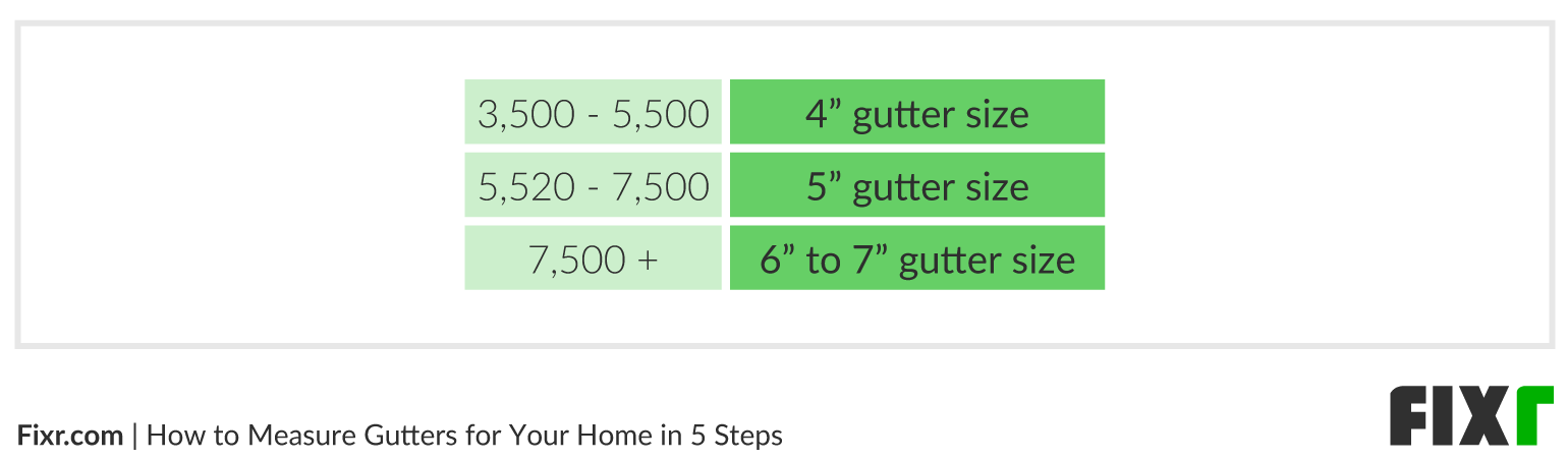 If your resulting figure from the calculation in step 4 falls between 3,500 and 5,500, you can use 4-inch gutters. Between 5,520 to 7,500, you need 5-inch gutters, while 7,500 and above should use 6-inch to 7-inch gutters depending on rainfall.