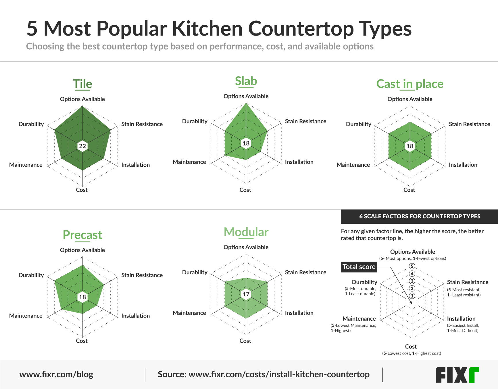 Like the graphic detailing materials, the types of countertops are broken down into the similarly comparable factors-options available, durability, stain resistance, maintenance, installation, and cost. "Types" of countertops is a much broader term and requires more varied comparison than when deciding on materials. This is because a slab could mean granite, quartz, marble, or solid surface, while tile could mean stone, glass, or ceramic. Therefore, each number given represents an average; it's important to cross-check the two graphics to get the most accurate idea of your chosen material.