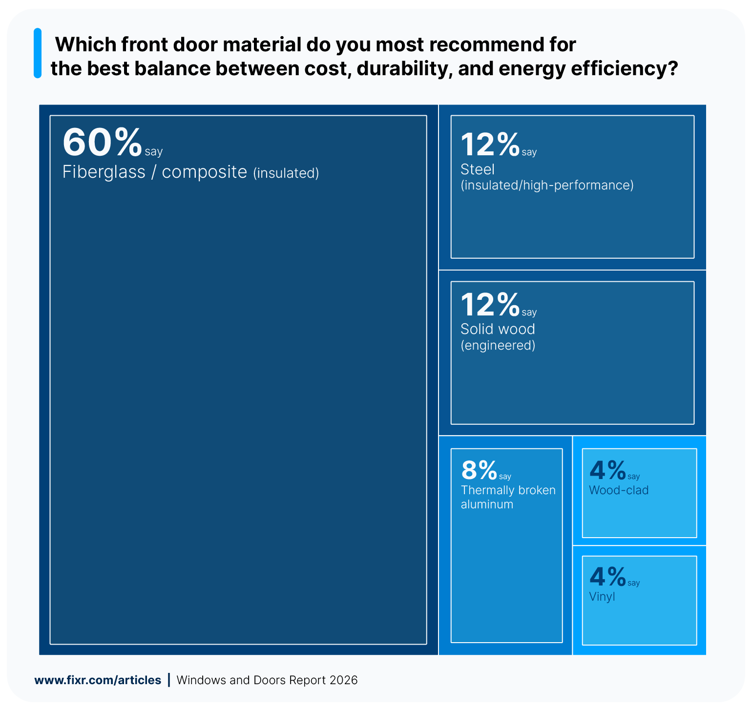 Both insulated/high-performance steel and solid wood (engineered) are seen as the best compromise by 12% of professionals. Steel offers high security and a modern look, while solid wood remains the gold standard for luxury and traditional aesthetics. Thermally broken aluminum is recommended by 8%, while wood-clad and vinyl are each chosen by 4% of experts for specific regional or budget-conscious projects. Wood-clad doors can mimic the look of solid wood doors while being less costly and requiring less maintenance.