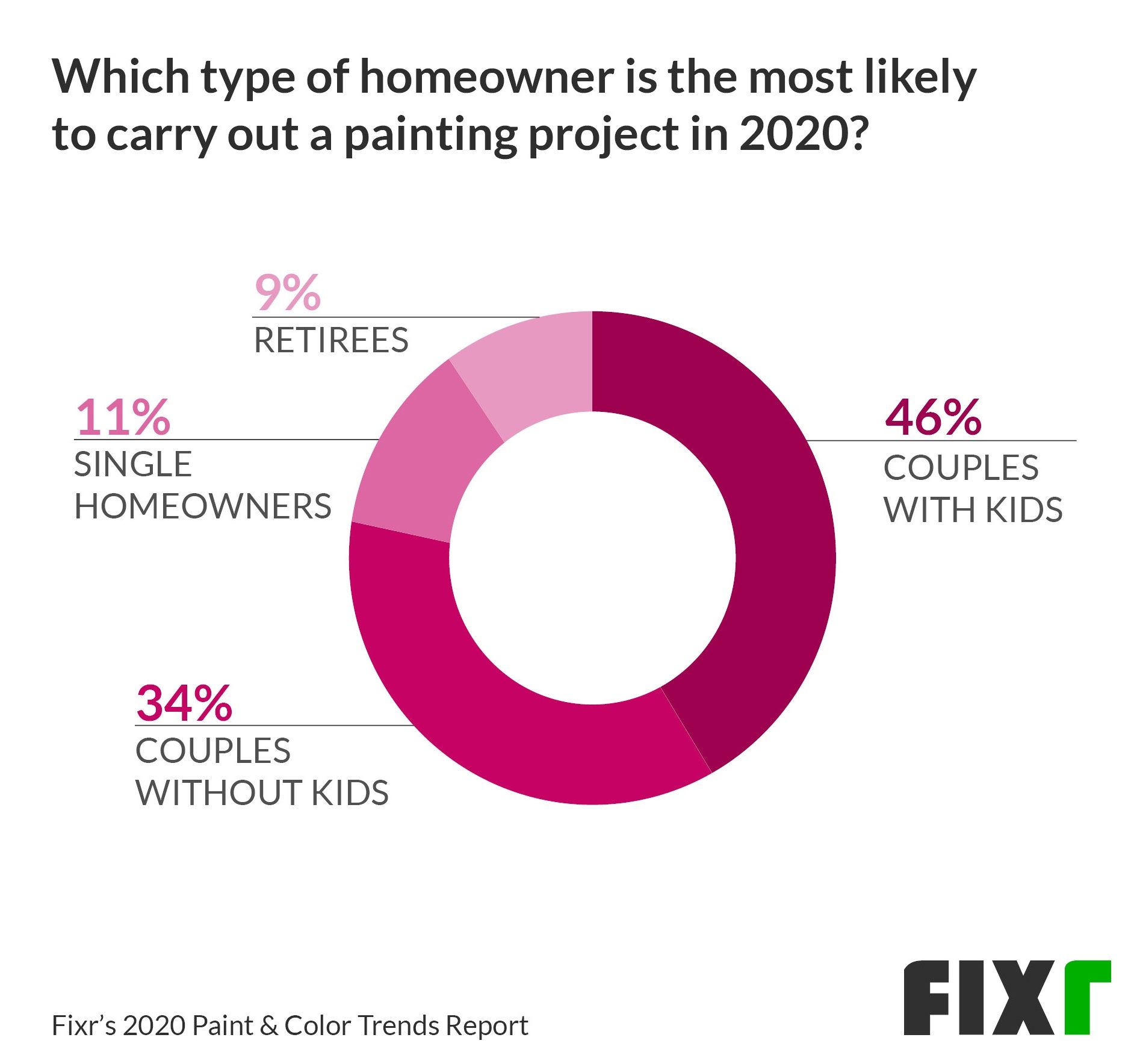 They concluded that homeowners that are couples are more likely to carry out a painting project this year than single homeowners or retirees. This likelihood is even higher if the couple has children. This could be true for several reasons including the fact that children's bedrooms tend to be painted more frequently, as well as hallways and other walls that become the victim of doodling.