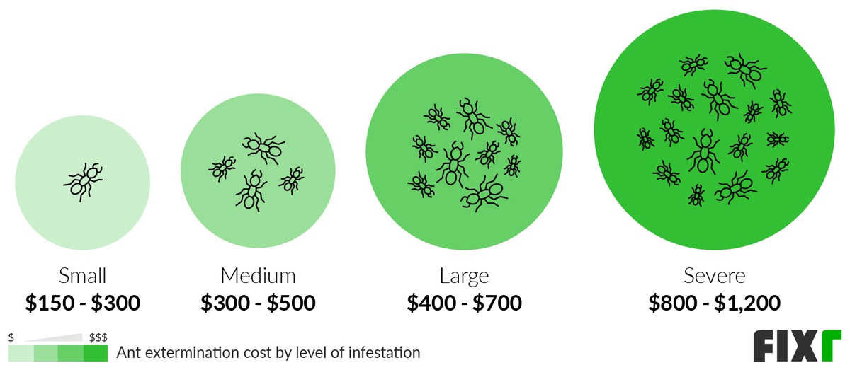 When ants gain a foothold in your home and start to multiply, you will pay between $300 and $500 to eliminate the infestation. A medium infestation means you will notice some species walking around your home, as well as some droppings (or "frass") in some areas. Your exterminator might need to visit a few times to finish the job but will provide you with an all-inclusive price before starting work.
