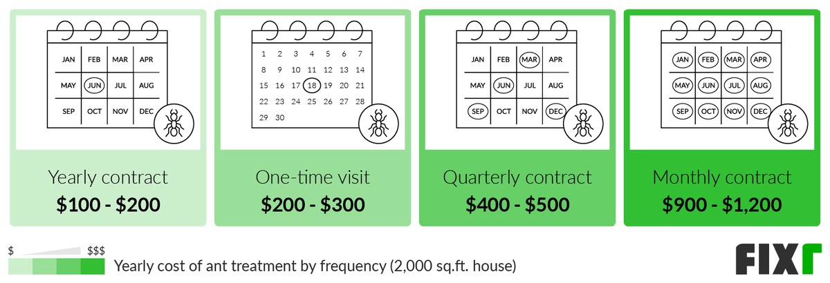 The frequency of treatment through an exterminator dictates the average price for getting rid of ants. A one-time treatment means they will only offer their services once. Pest control companies also offer contracts that allow homeowners the option to schedule routine service appointments. Routine extermination appointments are a necessity for those who want to prevent any infestations. More frequent service appointments come at a discounted rate compared to one-time treatment visits. Professionals will normally recommend one-time treatment for a small infestation, or extermination on small properties. They will recommend a contract-based treatment for a severe, recurring infestation, or large properties. The following are the average costs for the treatment of a 2,000 sq.ft. home. These costs refer to the total amount that the homeowner will pay at the end of the year. For example, if you hire a yearly contract, you will pay $100-$200 and the extermination company will only come once during the year, while a monthly contract ($900-$1,200) will mean that you will get these visits once a month.