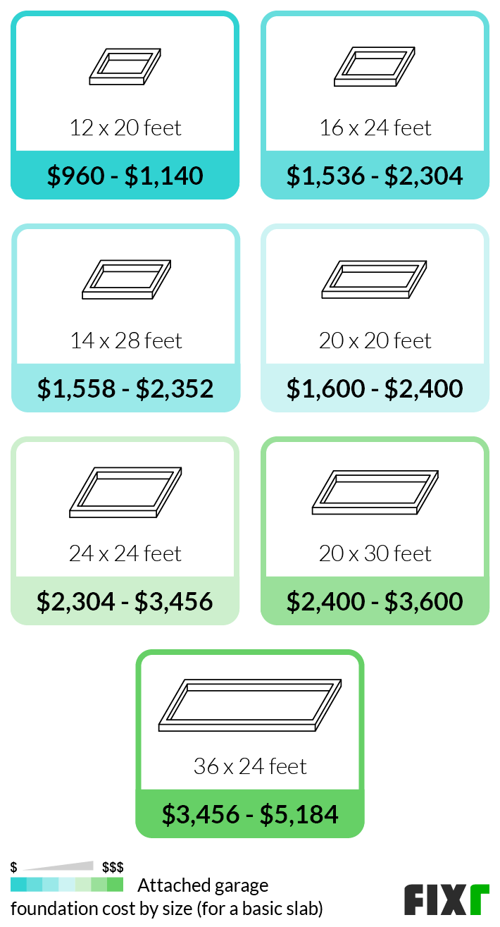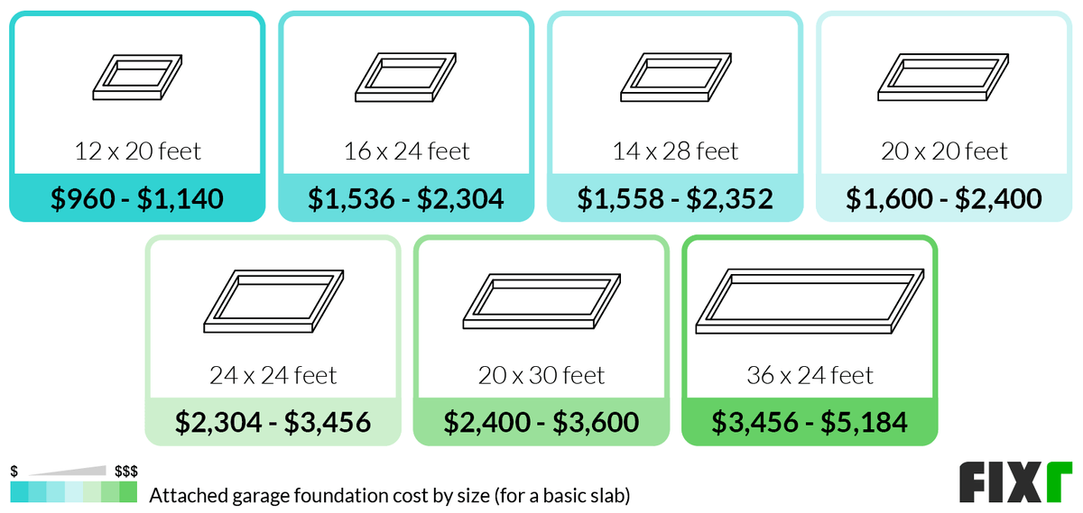 The average cost to build your garage’s foundation is $2,500 to $3,400 for a 24’ x 24’ 2-car garage. Most have a monolithic slab foundation that doubles as the floor of the garage and costs between $4 and $6 a sq.ft. If you require heavier footings like for supporting a living space above it or if you live in an area with frost concerns, then your costs can rise to $16 a sq.ft. Your foundation’s cost depends on the slab thickness and size. The following shows the average costs for monolithic slabs of varying sizes.