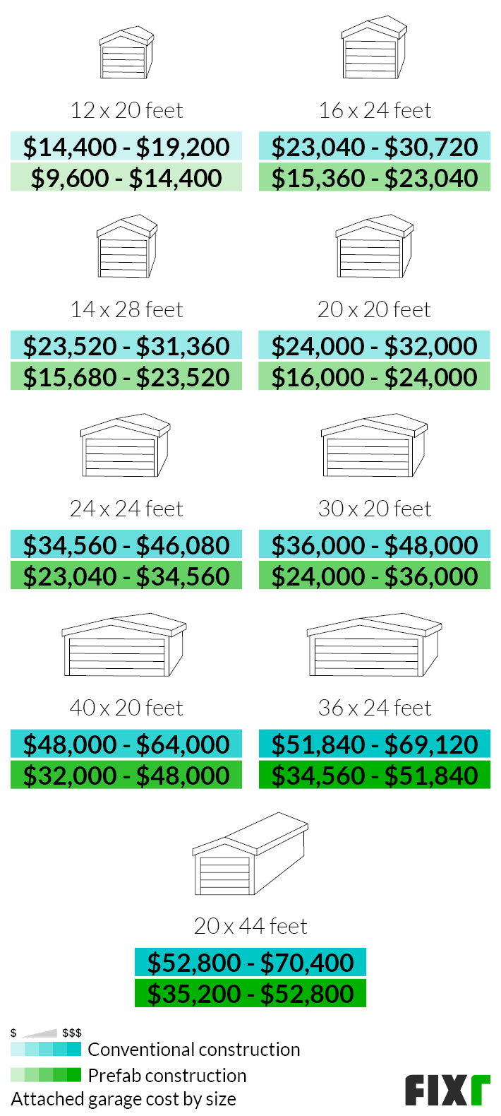 The cost of a 2-car attached garage is $24,000 to $46,080 when built using conventional methods. The cost when building a prefab garage is $16,000 to $34,560. They are the most common size when building this type of area. The minimum size for this type would be 20’ x 20’, but most opt for 24’ x 24’ for the added space. If you have large vehicles and will need more space for door clearance, or desire extra space for storage or other activities, consider increasing the footprint.