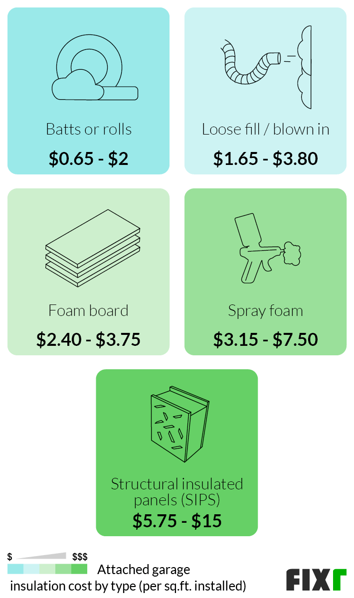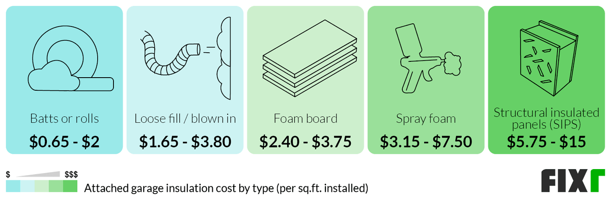 Cost per Sq.Ft. to Install Batts or Rolls, Loose Fill/Blown In, Foam Board, Spray Foam, and SIPS Attached Garage Insulation (mobile)