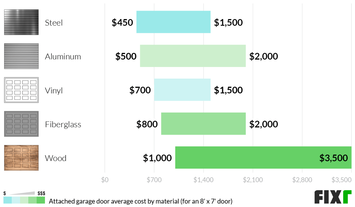 The average cost of garage doors for a 2-car garage is $800 to $3,500, depending on the material and style. For the installation of both single doors and double doors, you will find that the majority of contractors tend to charge a flat rate. The cost to install a single door is roughly $100 to $300, whereas for double doors the price range starts at around an average of $375 to $575. They are an integral part of a new attached garage. While there are double doors, which uncover both cars at once, it is more common to have one door for each vehicle stored in this space so that each has its own access. Your exact configuration varies depending on the style and dimensions. They come in several materials, impacting your project’s cost and how it looks. Below are the most common materials for doors and the costs of a single door.