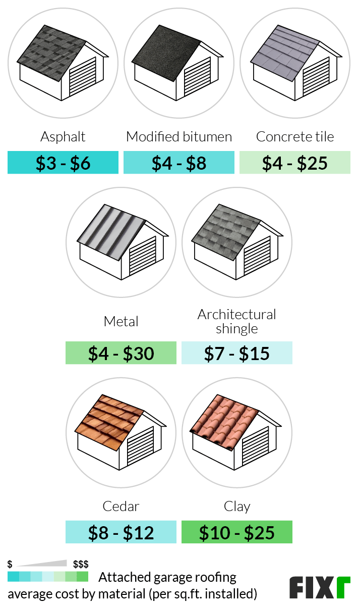 Cost per Sq.Ft. to Install Asphalt, Modified Bitumen, Concrete Tile, Metal, Architectural Shingle, Cedar, and Clay Attached Garage Roofing (mobile)
