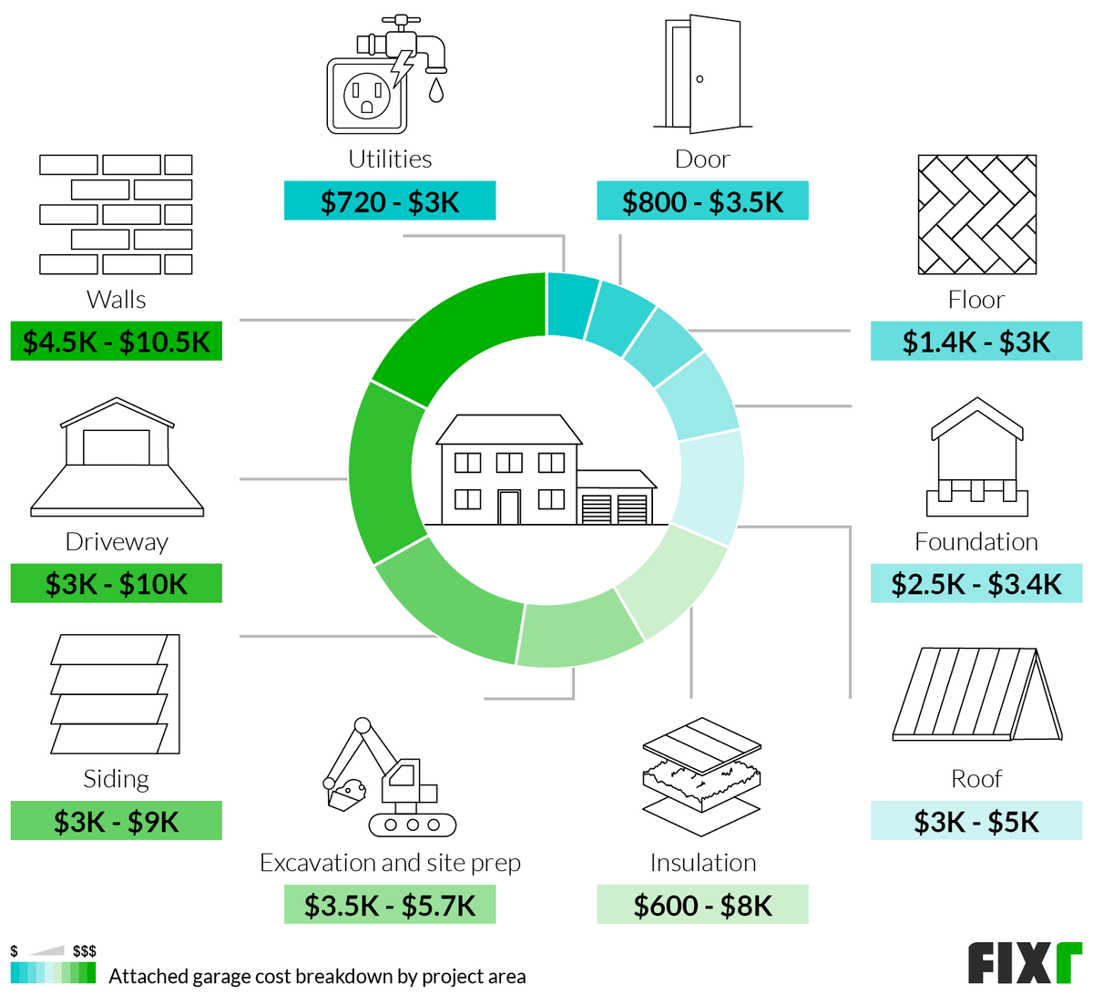 Attached Garage Cost Breakdown by Project Area: Excavation and Site Prep, Foundation, Floor, Walls, Insulation, Door, Roof... (mobile)