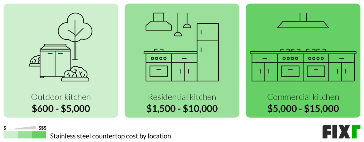 Stainless steel countertops are most commonly installed in kitchens - both commercial and residential. They hold up well in a wide range of circumstances and are easy to clean. They can also work for outdoor kitchens because they are not impacted by the elements like some countertops. Your project costs range depending on the countertop size and thickness and the stainless steel type. The costs below are based on the average sizes of each location.
