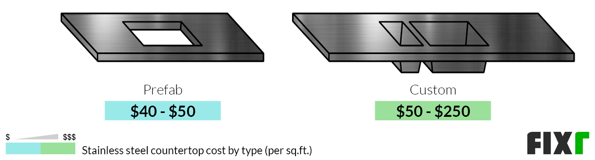 The cost of prefab stainless steel countertops is between $40 and $50 a square foot. Prefab stainless steel countertops are typically smaller than the average length of cabinet run in a kitchen. They are meant for smaller spaces or accents in a larger countertop area. They can include an integral sink or backsplash, but this sink size and shape is not customizable. Finishes are often limited, and the steel is often not as thick. These work best on islands, peninsulas, and short runs of cabinetry.
