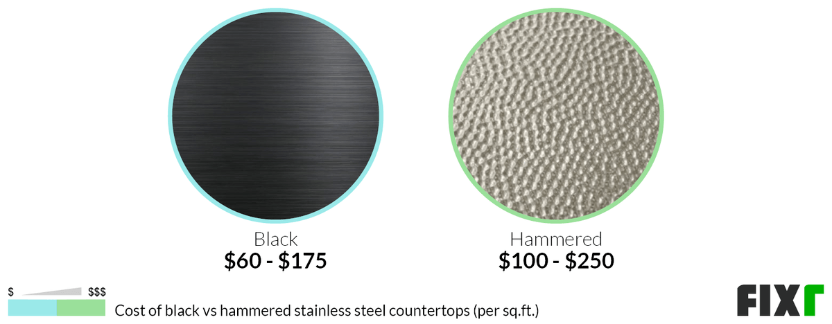 Hammered stainless steel countertops cost between $100 and $250 a square foot. Hammered finishes have a pitted surface that makes the steel appear as if it has been hit with a ball-peen hammer. This surface texture adds depth and disguises dents and scratches. It also resists showing fingerprints. Hammered stainless steel is usually still fairly reflective with a textured finish. To get this finish, you need a thicker gauge.
