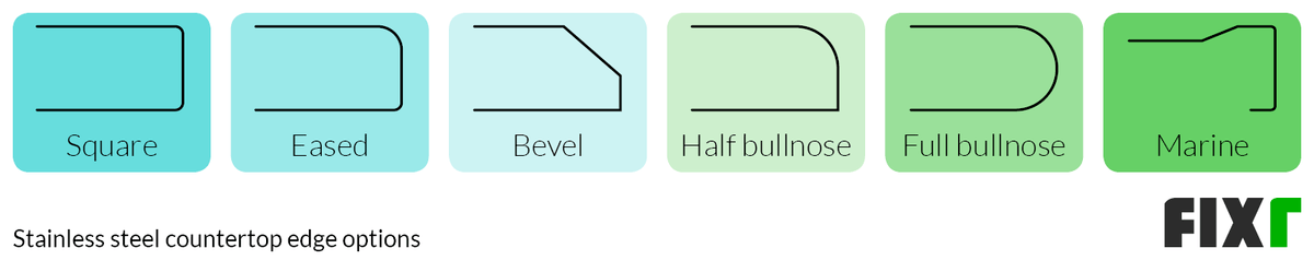 Common edges with a stainless steel countertop include: square, eased, bevel, half-bullnose, full bullnose, and marine (no drip).