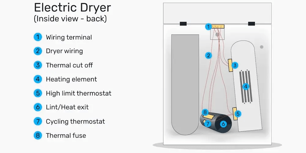 Whether you have an electric or gas dryer, replacing the heating element isn't terribly difficult either. You'll have to remove the back panels and disconnect the high limit thermostat and the wires.