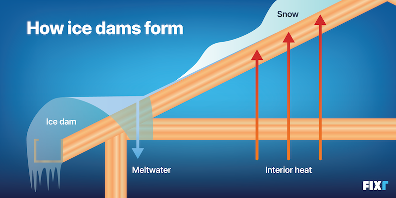 Ice dams form when roof snow melts and refreezes upon reaching the eaves. As more water flows down to the eaves, the ice dam builds in size.